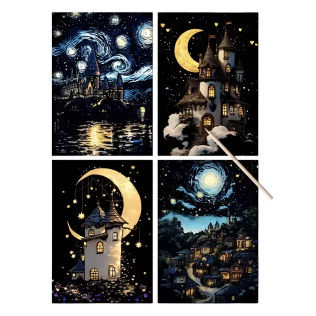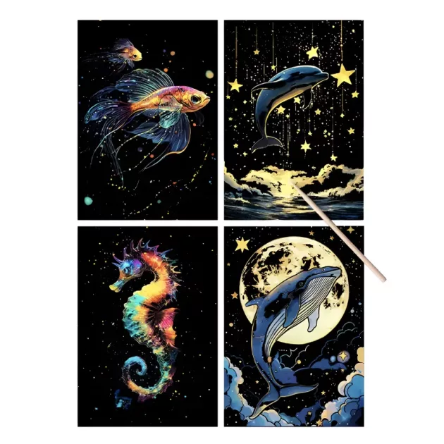 Regardez l'imagination de votre enfant prendre vie avec ce créatif. Chaque feuille révèle des couleurs vives et des formes enchantées à chaque grattage. Un amusement sans dégât qui garde votre maison propre tout en amusant les petites mains. Les créations terminées brillent la nuit, illuminant les chambres et apportant de la joie.