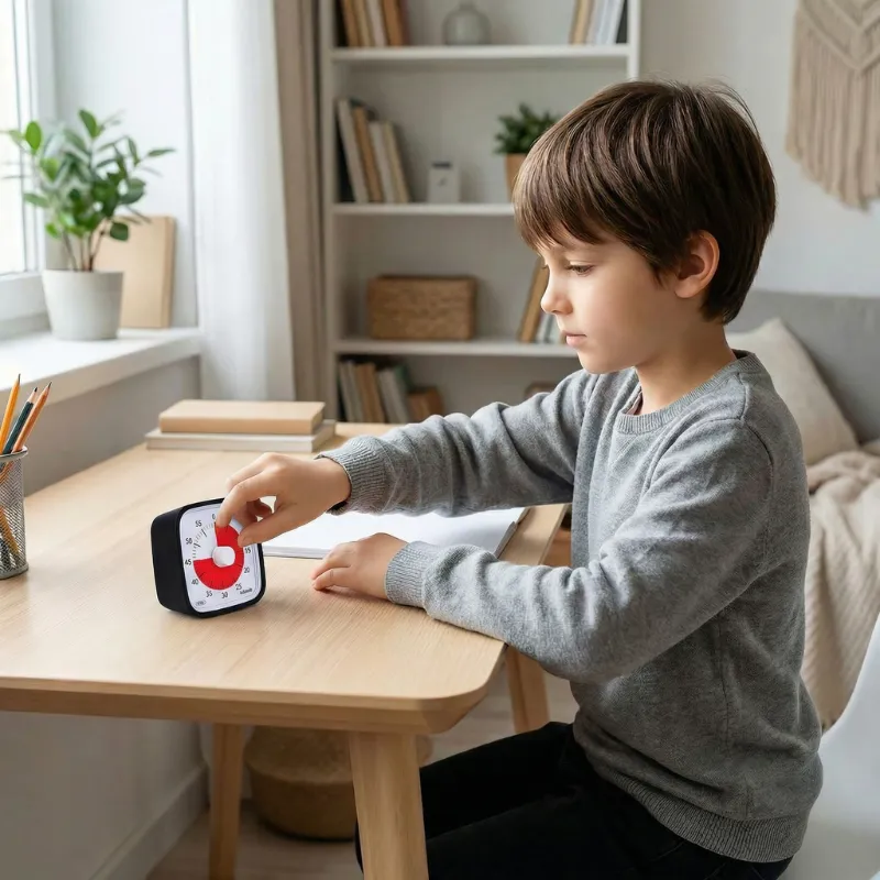 Acheté pour mon petit‑fils qui a du mal avec les transitions. Le compte à rebours silencieux lui donne un avertissement en douceur, et le passage du jeu au dîner est plus fluide.