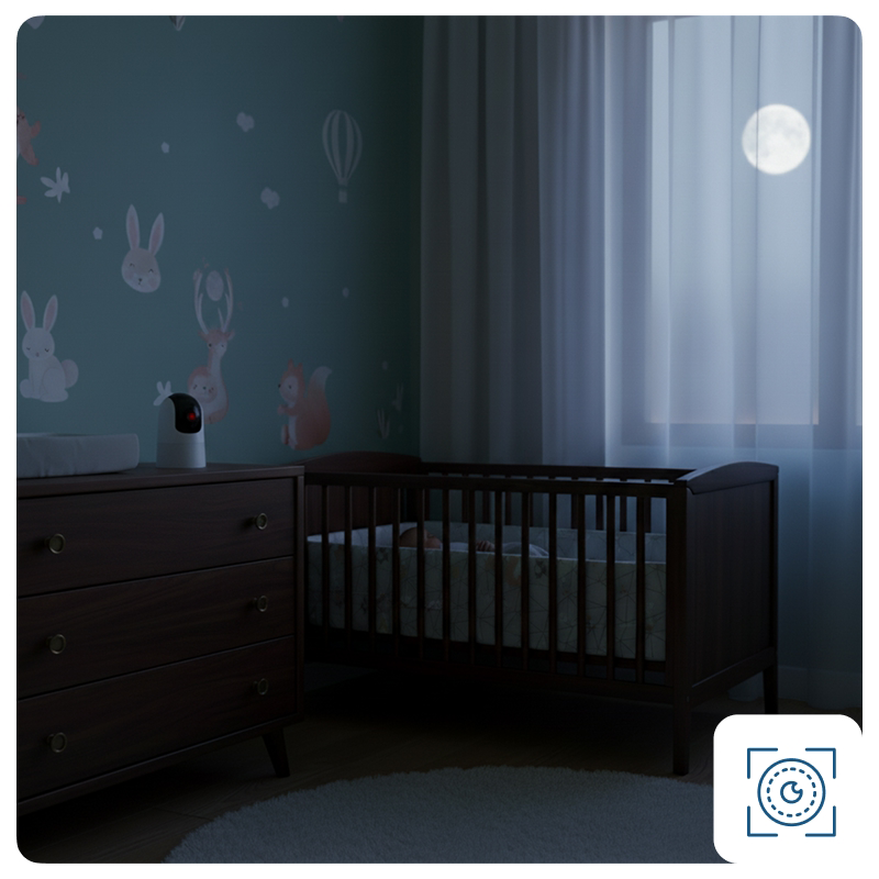 Vidéo ultra claire peu importe l’heure. Je parle à mon tout-petit dès qu’il se réveille et il adore entendre ma voix.