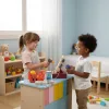 On utilise ce jouet avec des fruits et légumes factices. Mes enfants se relaient pour être caissier et client, ils apprennent le travail en équipe sans même s’en rendre compte.