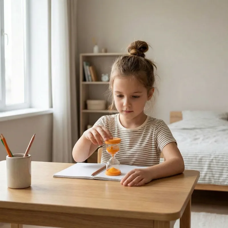 J’utilise ce petit sablier pendant le temps des devoirs. Ma fille se concentre mieux en sachant qu’elle doit juste travailler jusqu’au dernier grain de sable.