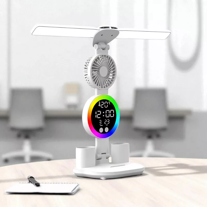 Je mets des alarmes avec l’horloge pour finir mon travail plus vite. La lampe est sympa et le ventilateur est doux tout en me rafraîchissant.