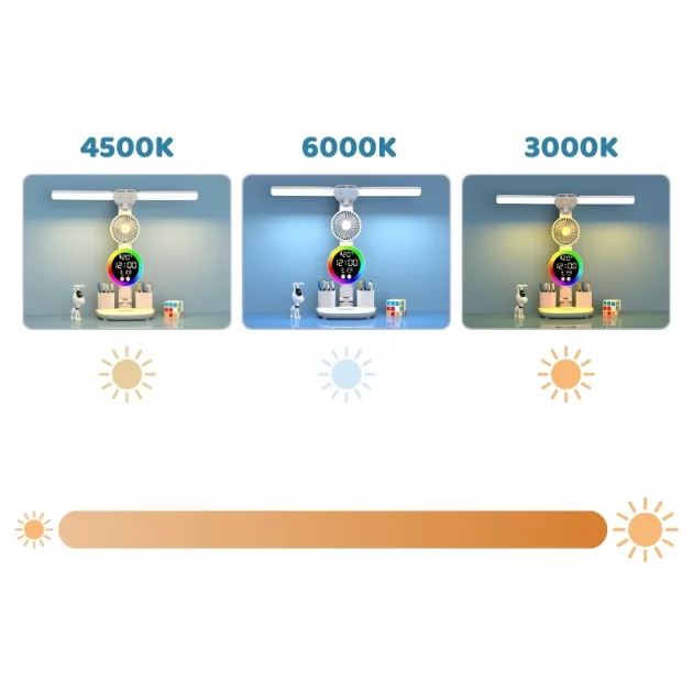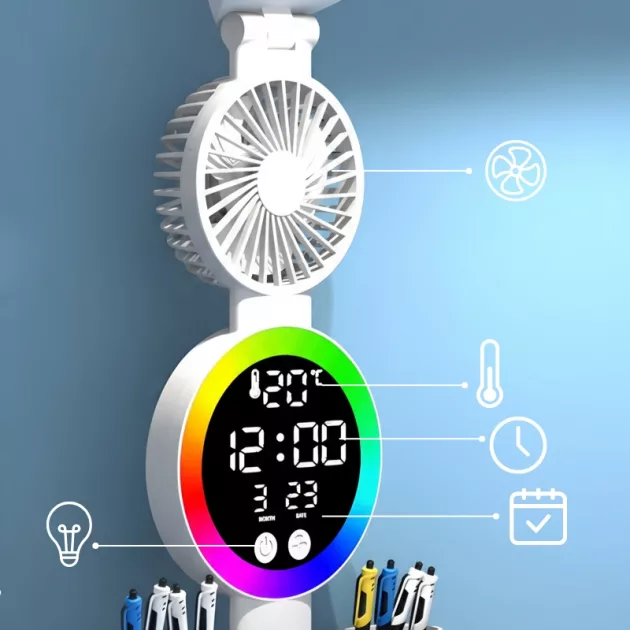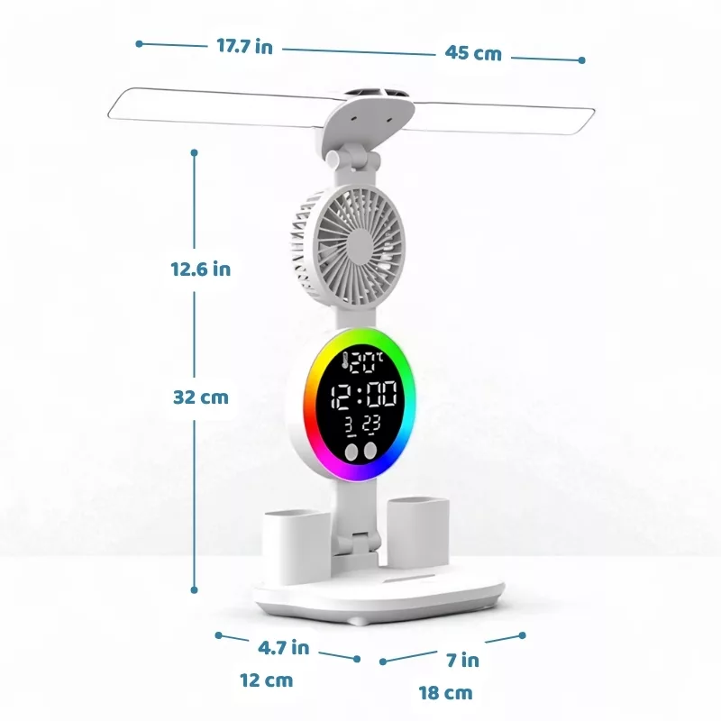 J’utilise la lampe chaque soir pour mes devoirs. Le ventilateur me garde au frais et l’horloge m’aide à gérer mon temps. Super utile !