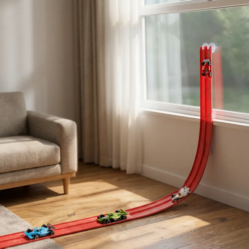 Premier jouet que je prends après l’école. Ma petite sœur pousse des cris de joie quand les voitures traversent le salon. Les ventouses tiennent même après de nombreux déplacements !