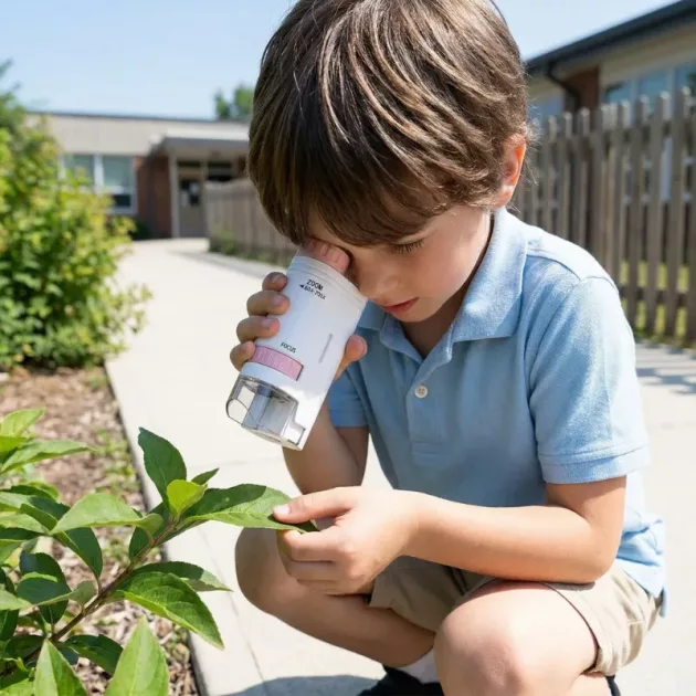Mon petit-fils avait l’habitude de se dépêcher pendant les balades dans la nature. Avec ce petit microscope, il s’arrête pour observer l’écorce, la mousse et les insectes. La lumière intégrée aide quand le sentier est à l’ombre.