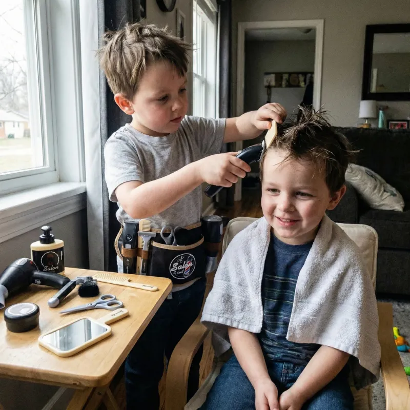Tous mes amis ont voulu jouer au salon de coiffure après que j’ai eu ce set. Tout le monde rigole et ça marche aussi pour faire semblant de laver ou couper les cheveux.