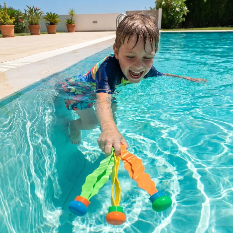 Ces petits jouets de plongée ont transformé mon fils de sept ans, qui hésitait, en vrai petit poisson. Chaque fois qu’il en attrape un au fond, il se pousse à rester un peu plus longtemps sous l’eau.