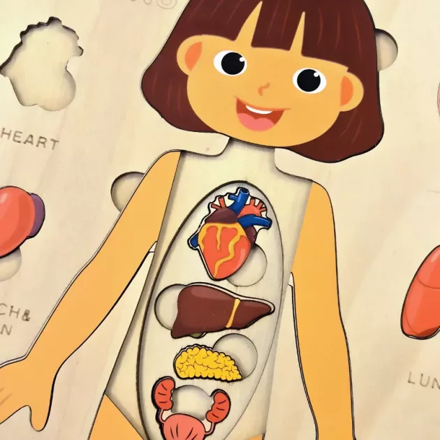 Les pièces en bois sont lisses et s’emboîtent vraiment bien. Ma fille a appris les noms des organes après seulement quelques essais. Elle le prend tous les jours.